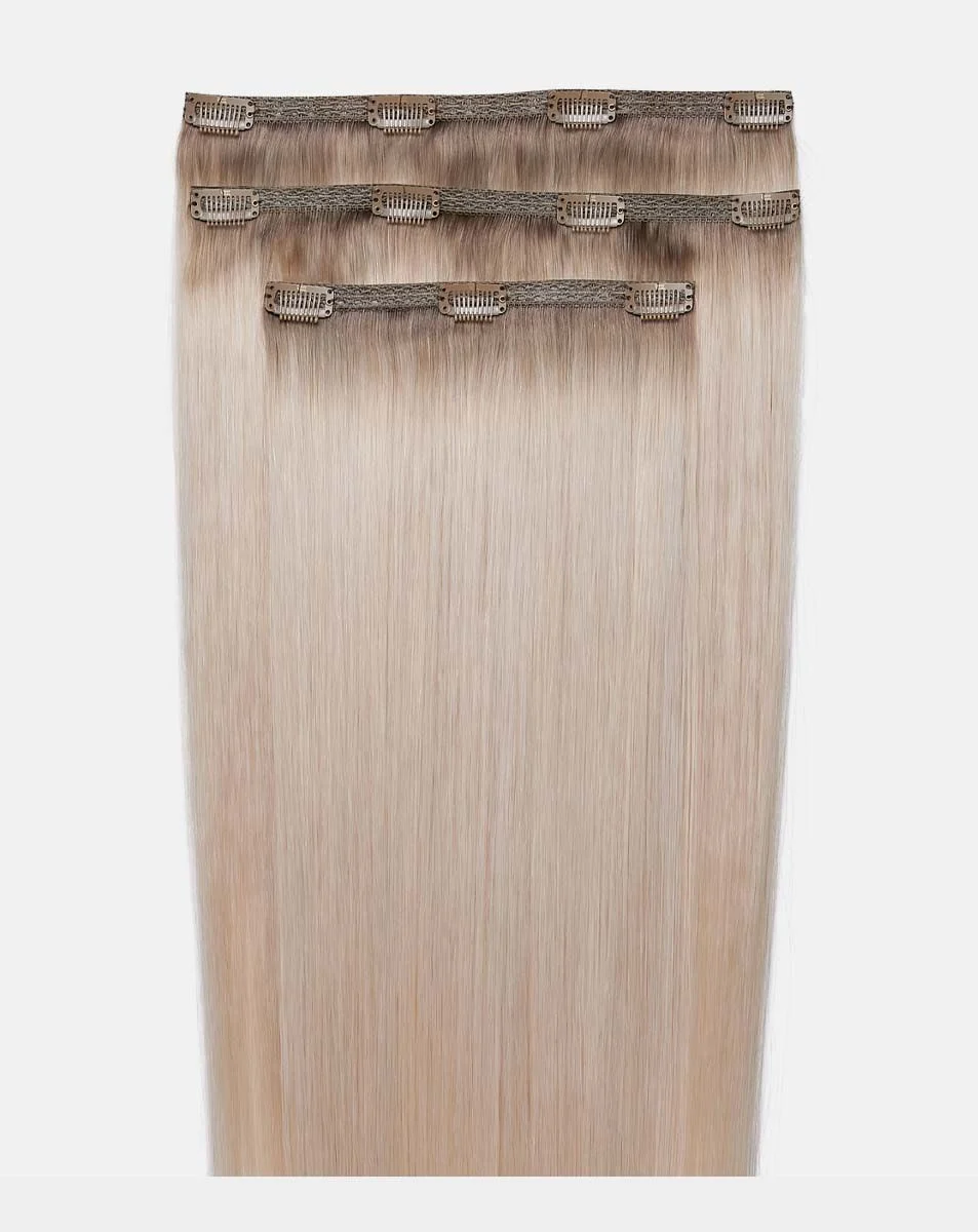 For Fine to medium hair types.Beauty Works Award winning Deluxe clip-in hair extensions are the ultimate DIY extension system. Easy to apply in the comfort of your own home without glue or special tools – these clip in extensions let you change your hair length as often as you change your mind. A Hairdrobe® essential, these clip-in hair extensions usually last many months or can last up to a year depending on the general care they receive.Our clip-in system has been cleverly designed using a unique three piece system, using a lace weft structure the hand selected hair is compacted onto three easy to use flat weft strips. Allowing you to wear your hair in a variety of hairstyles that our completely discreet and lightweight. Featuring a protective silicon layer on each clip to cushion your natural hair and protect breakage.Our deluxe clip-in extensions our made from hand selected 100% Remy cuticle retained human hair to create a natural look you would normally associate with permanent salon hair extensions. The cuticle retains the hairs natural shine and vitality allowing the hair to behave tangle-free throughout its lifetime. This hair type is reusable and can be heated, styled and washed just like your own hair. And while Remy human hair can be more of an expensive pick, with the proper care, it is durable and can last many months.