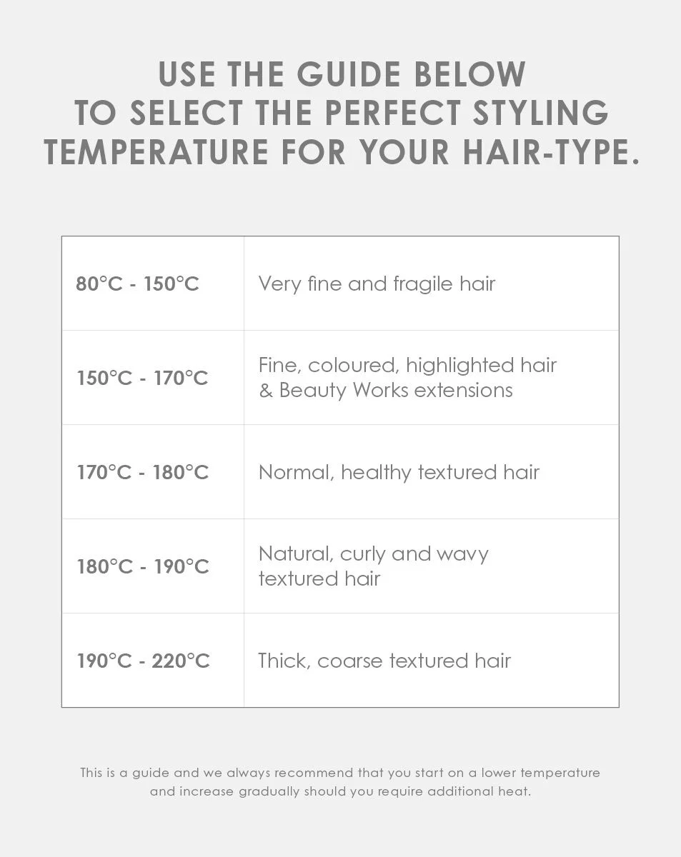 Use the guide below to select the perfect styling temperature for your hair-type. This is a guide and we always recommend that you start on a lower temperature and increase gradually should you require additional heat.